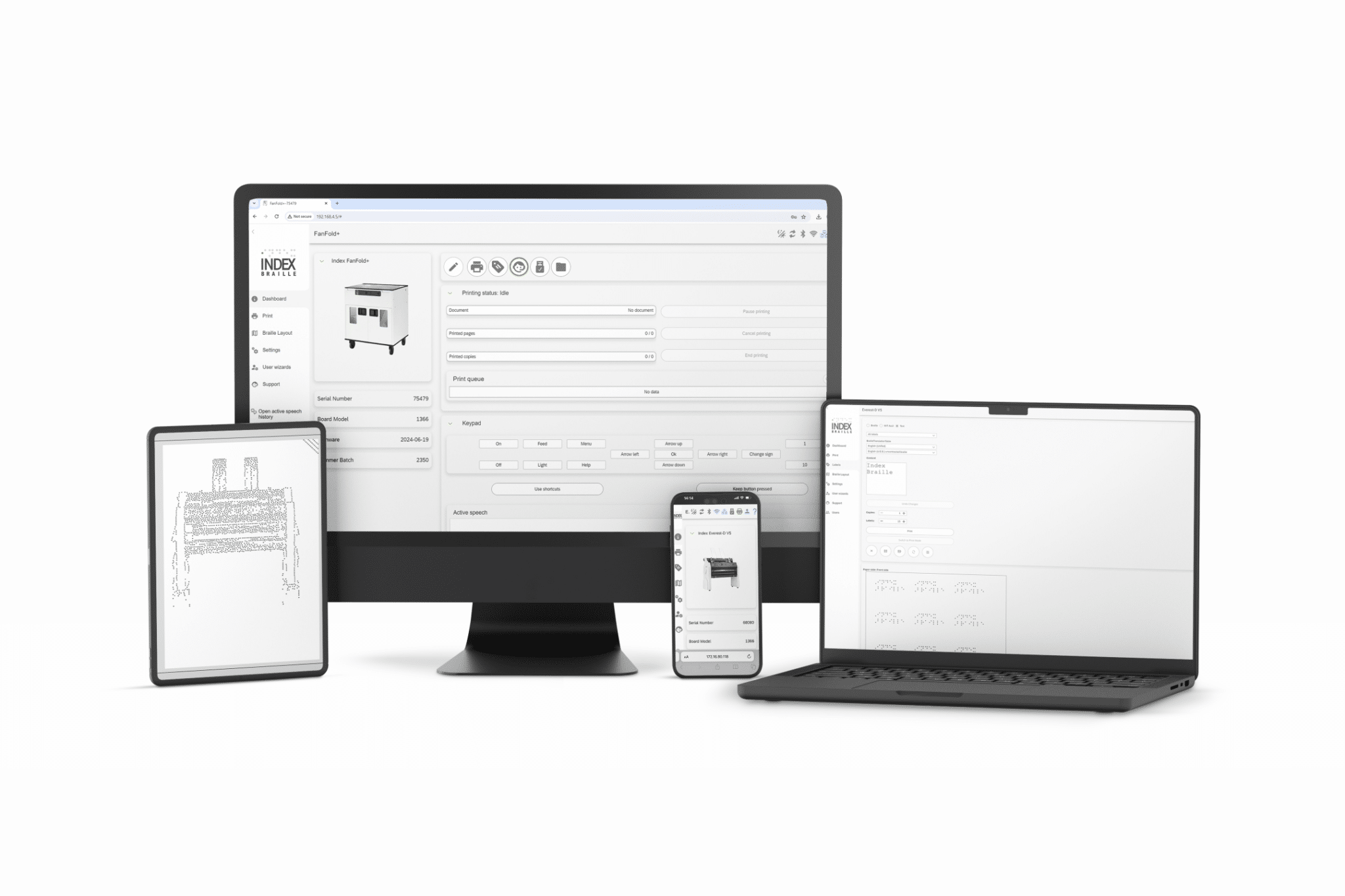 The unique Index Web Interface, included free of charge in all V5 embossers, is a game changer. No installation or registration is needed. Simply connect your embosser to a wired or Wi-Fi network and you can print files, manage braille layouts, edit embosser settings, and view braille embosser information. The Web Interface can be used from any device with a browser, like a computer, tablet or a smartphone.